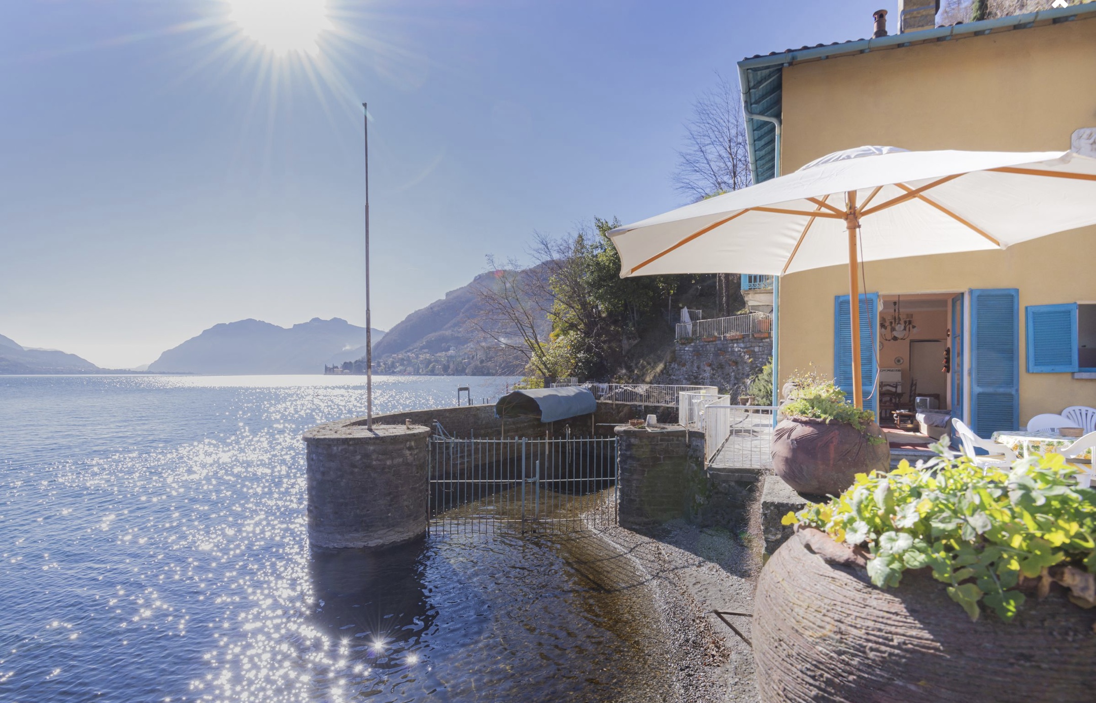 Exklusive und charakteristische Villa der frühen ‘900 von insgesamt mq.130, zusätzlich zu den Nebenräumen auf der Rückseite der Villa, die schönen flachen Garten von etwa 400 direkt am See und die “große offene Dock von mq.130 und die private Anlegestelle für das Anlegen von Booten bis zu 8 Metern.